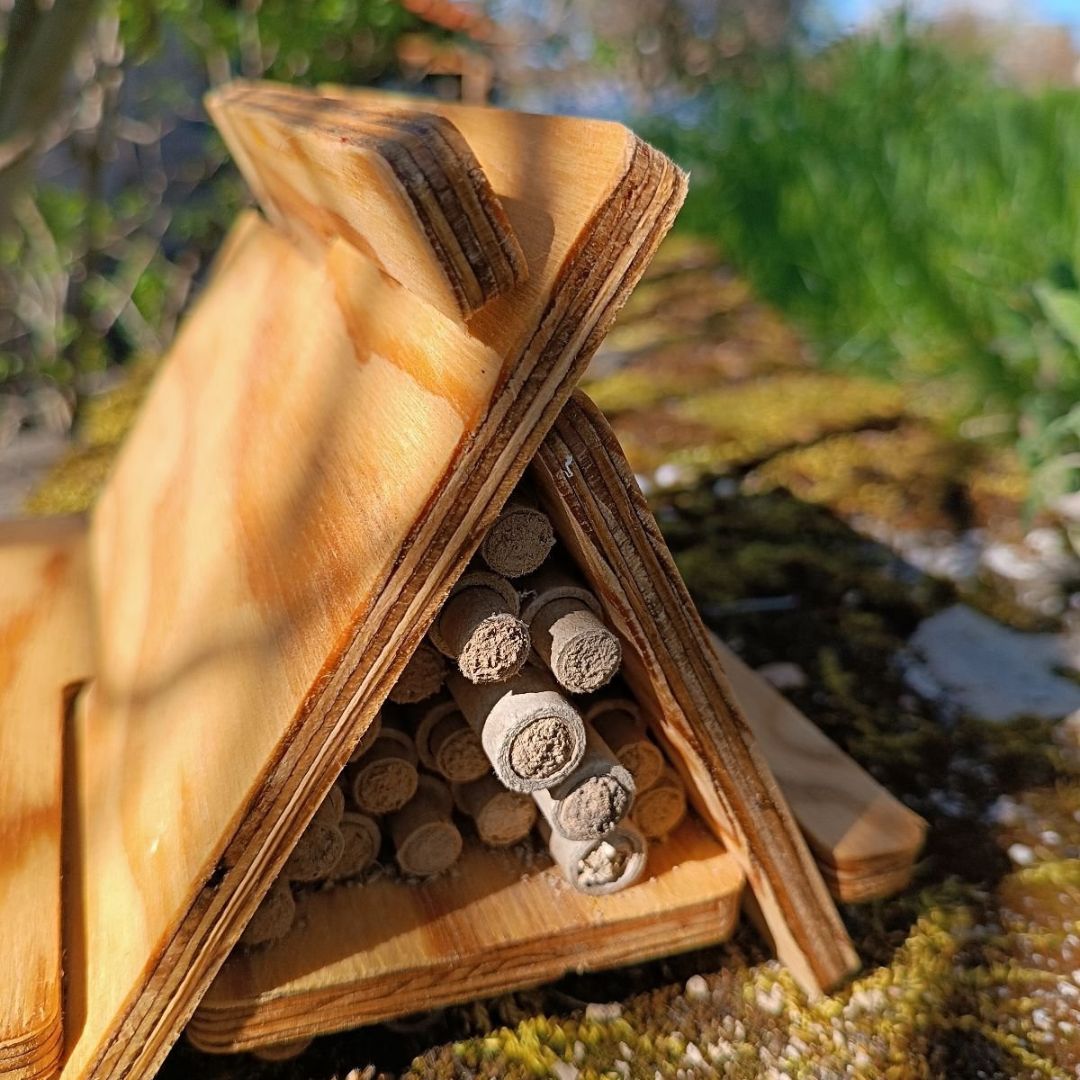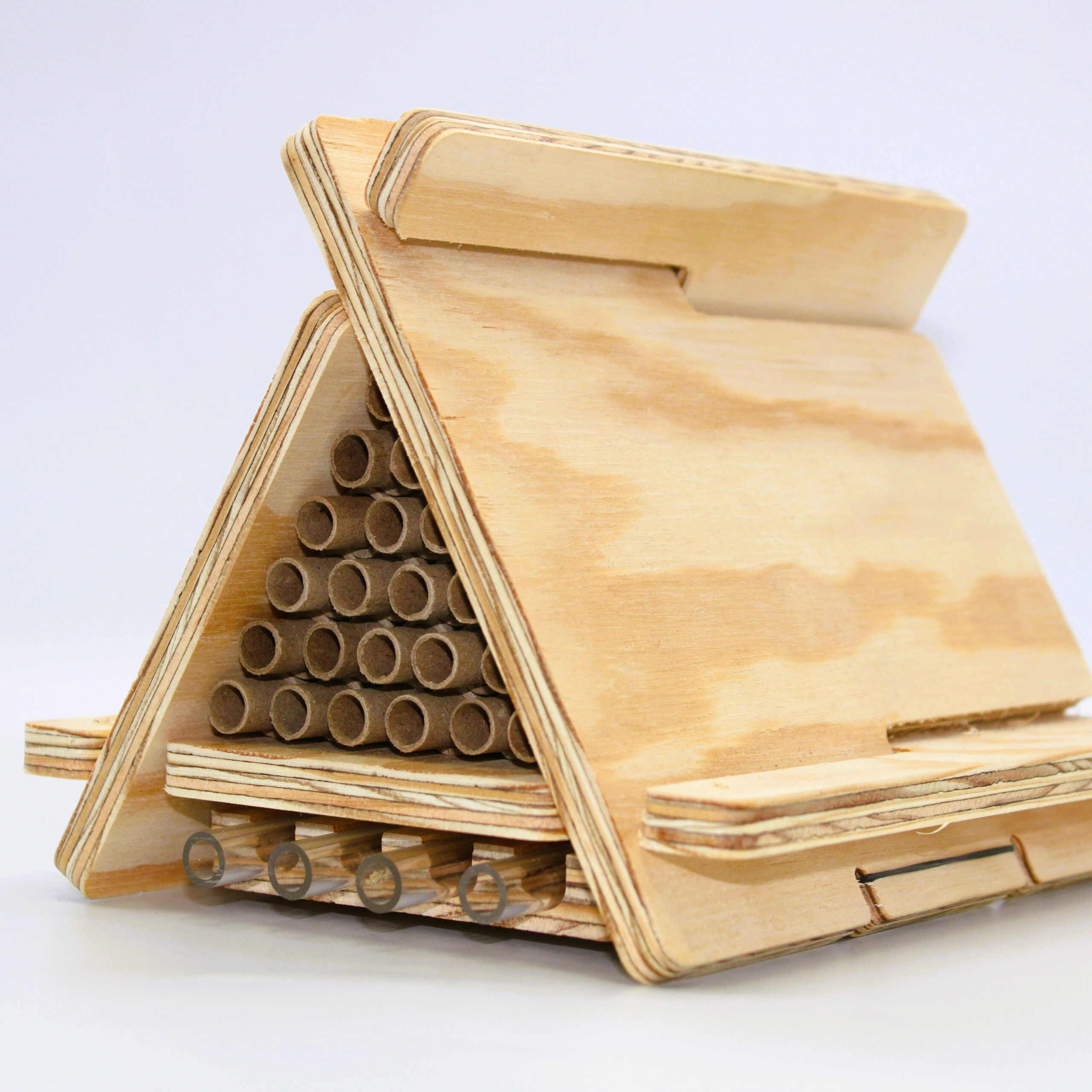 Vous recevez le Dorlotoir Tipi Essentiel – hôtel à abeilles solitaires – et ses accessoires : tunnels en carton et tunnels d’observation transparents. Vous l’installez dans votre jardin ou sur votre balcon pour accueillir les abeilles de votre environnement et leur permettre de nicher en toute sécurité.